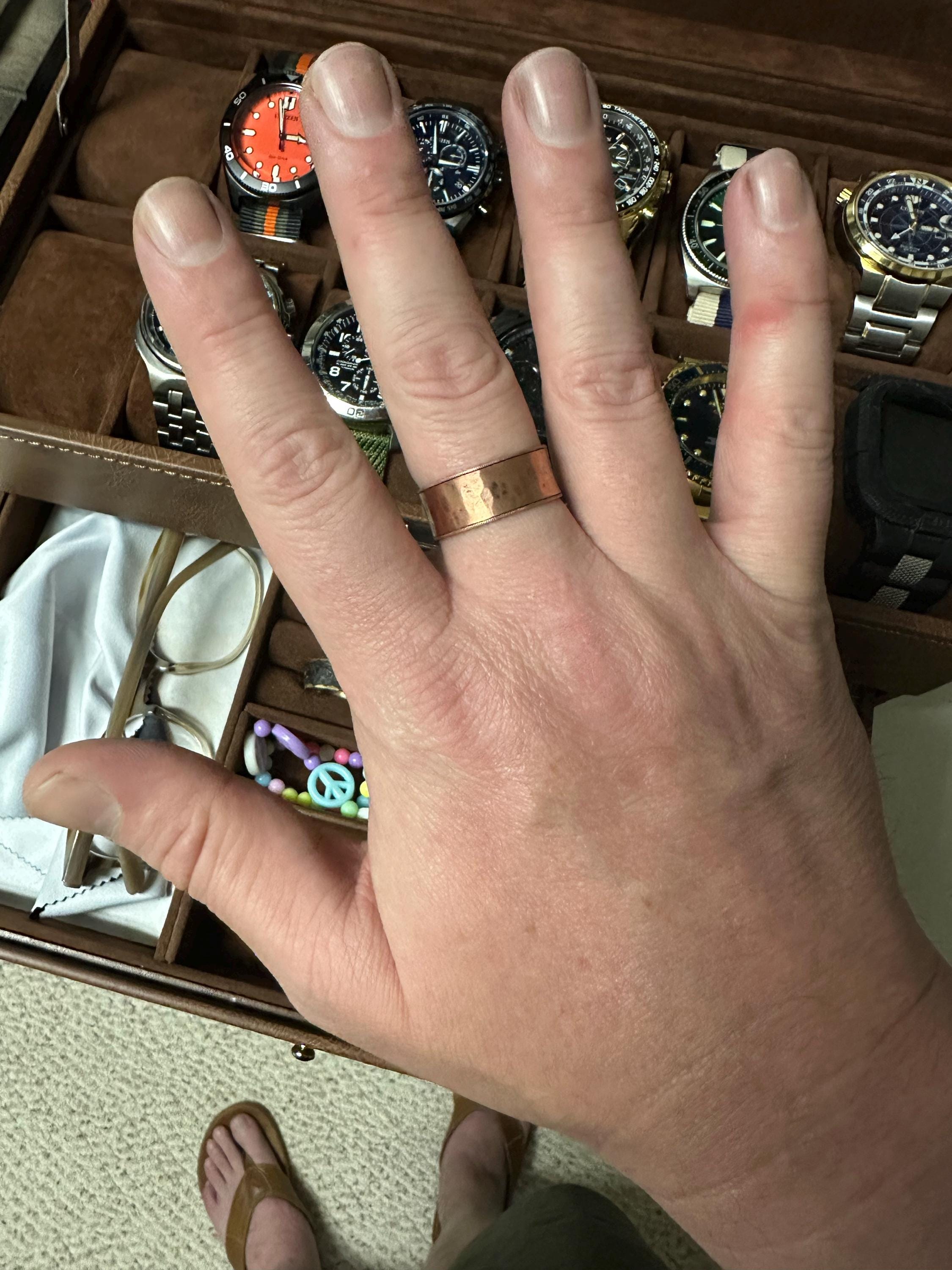 Such a rad and artistic piece of work. I learned my skin is sensitive to copper (colors my skin), but I’m getting some clear nail polish to seal the inside periodically. The detail and color of this piece is awesome. It’s a stupidly great deal too.
