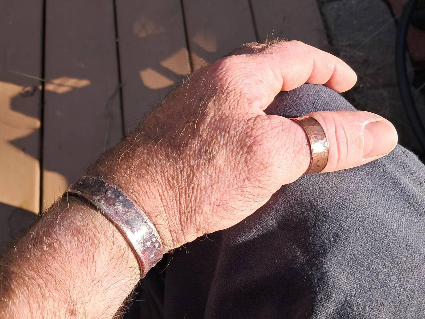 I Make These From Recycled 1/2 Inch Copper Pipe. This Band Ring Is, 10mm, Just Under 1/2 Inch, Wide. Hammered With Milled Edges To Grab The Attention. This Looks Great On Men Or Women Who Like Chunky Jewelry. They Look Nice With A Patina For An Antiqued/Storied Look.