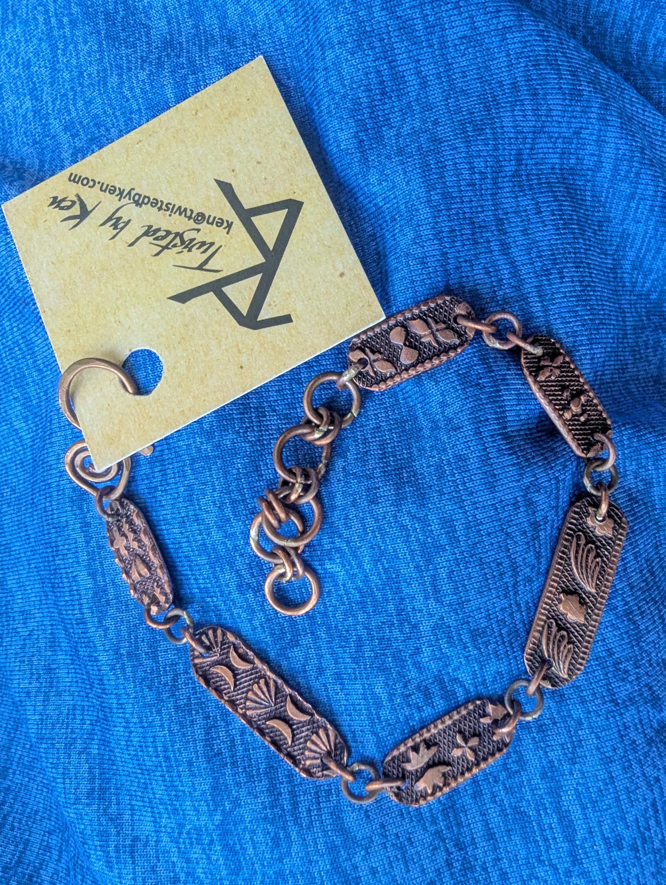 Handmade Recycled Copper Chain Bracelet with Unique Patterned Tiles, Custom Sized, Eco-Friendly Jewelry TBK088