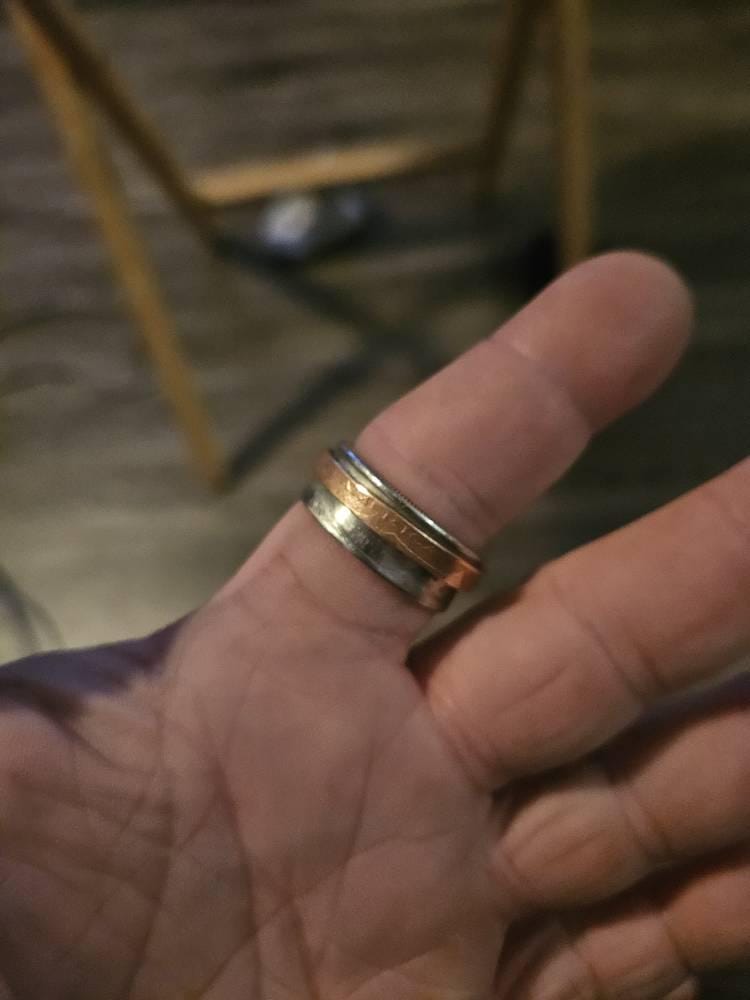 A unique blend of style and functionality, this handmade spinner fidget ring. This striking ring features an outer spinner made from a copper U.S. penny and a chunky band crafted from a U.S. Kennedy half dollar, offering a bold two-tone design, perfect for jewelry lovers or collectors. Each ring is made to order and custom-sized to fit your finger, U.S. ring sizes, half sizes, and quarter sizes on request, ensuring a perfect fit.